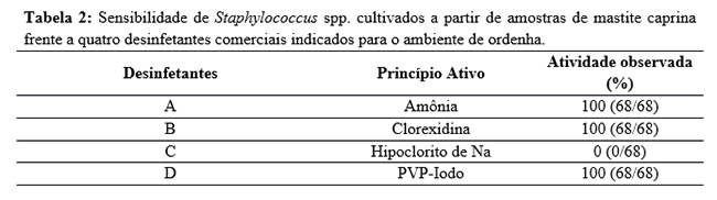 Os desinfetantes comerciais com os princípios ativos amônia quaternária, clorexidina e iodo foram os que apresentaram as melhores atividades in vitro sobre as amostras de Staphylococcus spp. provenientes de mastite caprina. O mesmo não ocorreu com o hipoclorito de sódio. No entanto, os dados obtidos no presente estudo não permitem estabelecer uma relação entre a resistência aos desinfetantes e produção de biofilme nos isolados. Contudo, é fundamental tanto a realização periódica do perfil de sensibilidade aos desinfetantes quanto o conhecimento das características e concentrações de cada produto antes de empregá-los nos programas de controle da mastite e qualidade do leite.