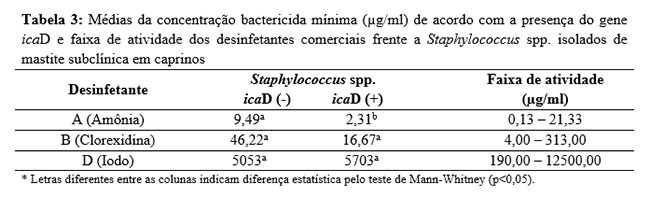 CONCENTRAÇÃO BACTERICIDA MÍNIMA DE DESINFETANTES COMERCIAIS FRENTE A Staphylococcus SPP. ISOLADOS DE MASTITE EM CAPRINOS E DETECÇÃO DO GENE icaD