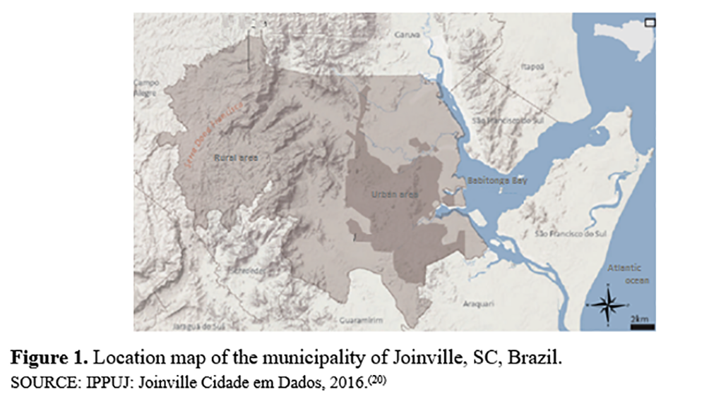 This study was carried out in the city of Joinville, located in the northern coast of the state of Santa Catarina (26°18′14″ S and 48°50′45″ W), in the South of Brazil. It has a total extension of 1,124.10 km2, with 913.7 km2 of a rural area and 210.4 km2 of an urban area(15), bordering the Serra do Mar and Babitonga Bay (Figure 1). The altitude ranges from zero to 1,325 meters and, according to the classification of Köppen and Geiger(19), the regional climate is Cfa, described as humid to super humid, dependent on the Atlantic Polar mass (winter and autumn) and Atlantic Tropical mass (summer and spring) for the season and temperature changes. There is no dry season, and temperatures range from 31 °C (maximum means) in January to 13 °C (minimum means) in July, with mean annual relative air humidity of 76.04%.