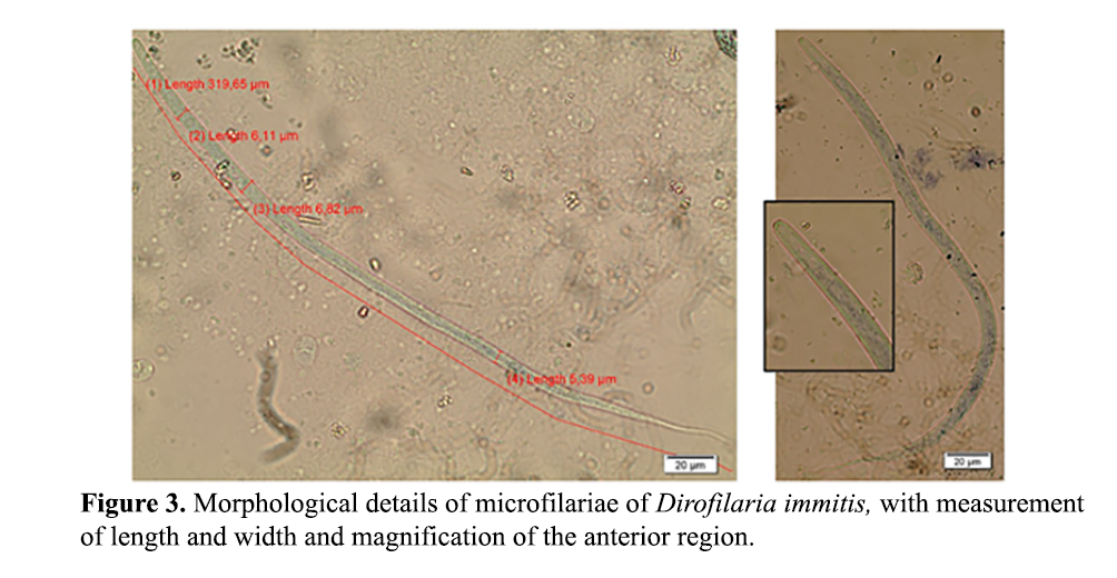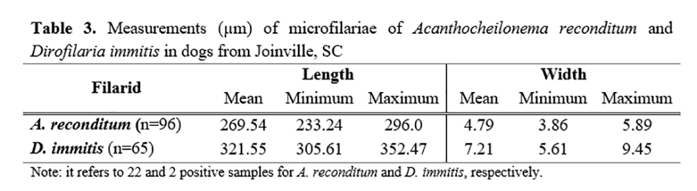 The samples were stored under refrigeration in tubes with EDTA and sent to the Laboratory of Veterinary Teaching and Diagnosis – Parasitology of the Federal Institute of Santa Catarina, Araquari Campus, for processing. The whole blood was subjected to the modified Knott technique(21), and the plasma obtained by centrifugation was frozen at −18 °C. The twenty-four microfilaremic samples found throughout the experiment had larvae measured under an Olympus microscope using the Software Cellsens Standard® program. All samples of the second and third phases, as well as those that presented microfilariae in the first experiment, were submitted to the SNAP 4Dx® Plus clinical diagnostic kit, IDEXX. Additionally, samples from the first and second phases were also evaluated in the thick-drop method(22).