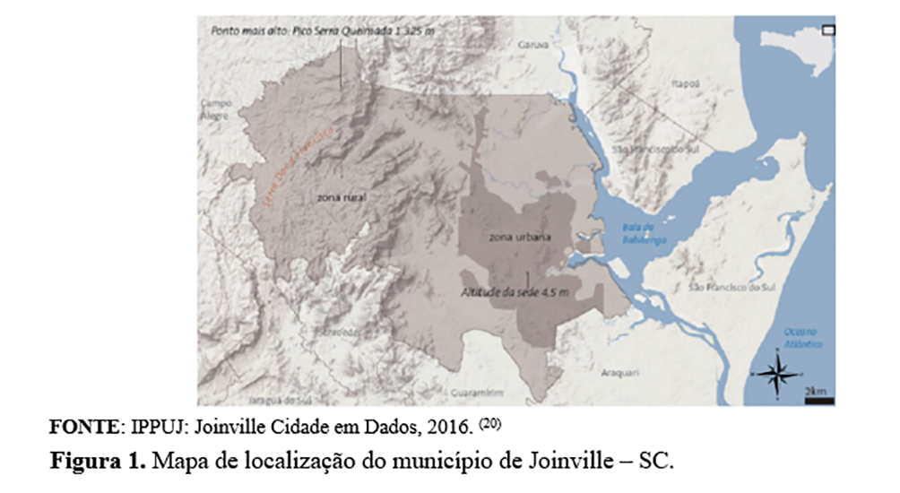 O trabalho foi desenvolvido no município de Joinville, localizado no litoral norte do estado de Santa Catarina (26° 18' 14" S 48° 50' 45" O), região Sul do Brasil. Possui extensão total de 1.124,10 km2, sendo 913,7 km2 de área rural e 210,4 km2 de área urbana(15), limítrofe à Serra do Mar e à Baía da Babitonga (Figura 1). A altitude varia de zero a 1325 metros e, segundo a classificação de Köppen e Geiger(19), o clima da região é do tipo Cfa, descrito como úmido a superúmido, dependente da Massa Polar Atlântica (inverno e outono) e da Massa Tropical Atlântica (verão e primavera) para as mudanças de estação e temperatura. Não há estação seca e as temperaturas variam de 31ºC (máximas médias) em janeiro a 13ºC (mínimas médias) em julho, com umidade relativa média anual do ar de 76,04%.