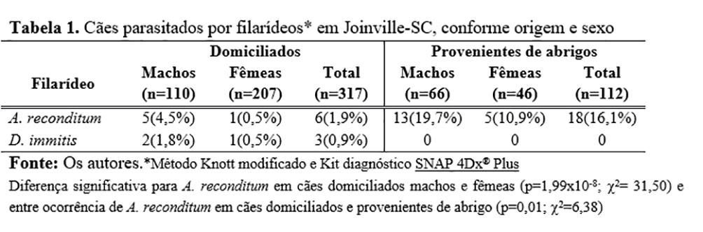 Apesar de Bublitz et al.(18) terem relatado oito casos de dirofilariose humana em Joinville, não há estudos que indiquem a prevalência de cães parasitados por filárias na cidade. Logo, o objetivo deste trabalho foi realizar um levantamento da ocorrência de filarídeos parasitos de cães domiciliados e cães provenientes de abrigos animais, residentes no município de Joinville-SC.