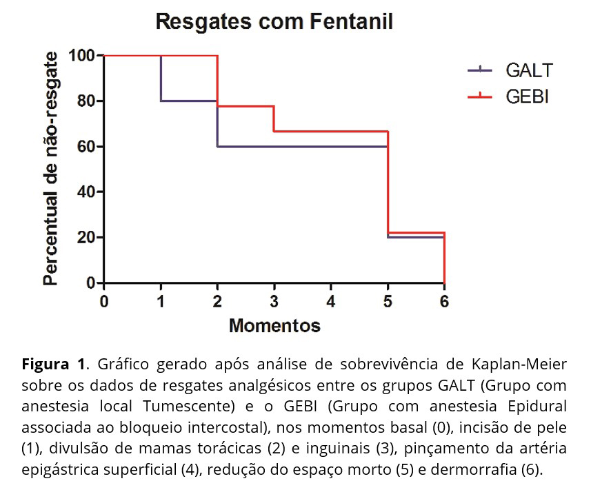 As pacientes do grupo GEBI apresentaram maior quantidade de resgates analgésicos no momento de redução do espaço morto, todavia não houve diferenças estatísticas entre os grupos e os momentos cirúrgicos avaliados após a realização da análise de sobrevivência de Kaplan-Meier, conforme observado na Figura 1.