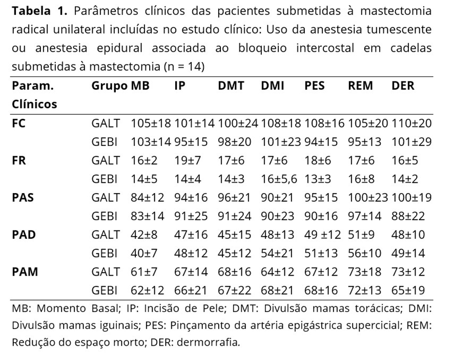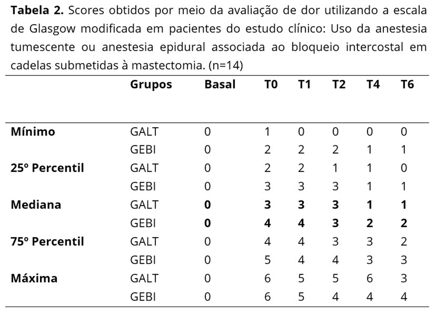 Em relação à avaliação de dor pós-operatória, os resultados obtidos demonstram que ambas as técnicas descritas nos diferentes grupos se mostraram eficazes para analgesia de até 6 horas após o procedimento cirúrgico, sendo que não houve necessidade da realização de resgates analgésicos. O resultado do GALT vem ao encontro do que já foi descrito por Credie(5) e Aguirre(13), de que a ALT proporciona analgesia adequada no pós-operatório, porém há escassos relatos sobre o uso da anestesia epidural associada ao bloqueio intercostal para a realização de mastectomias em cadelas. Os resultados foram semelhantes aos obtidos no presente estudo, de que a técnica é eficaz para o pós-operatório(11).