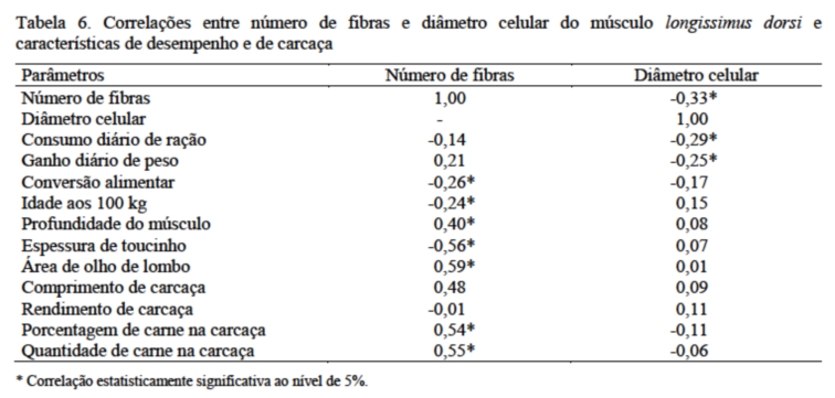 Na Tabela 6 estão apresentados os resultados da correlação entre as características histológicas do longissimus dorsi e as características de desempenho. A correlação fenotípica entre o número e o diâmetro celular foi negativa e moderada (-0,33), indicando que quanto mais fibras musculares, menor tende a ser seu diâmetro. A correlação fenotípica entre o número de fibras e a conversão alimentar e a idade aos 100 kg de peso vivo foi de moderada a baixa, indicando que animais com mais fibras musculares têm melhor conversão alimentar e atingem os 100 kg de peso vivo mais precocemente.