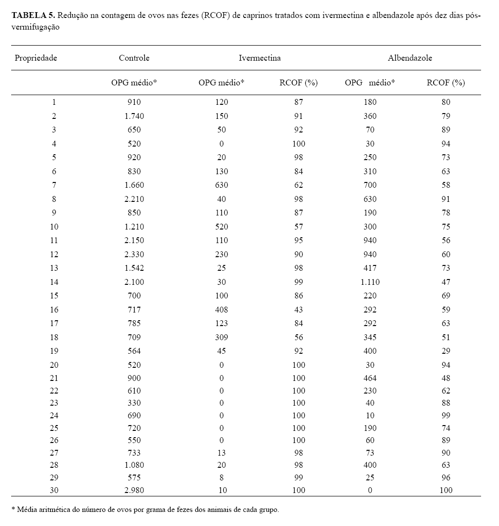 42,8%. A redução na contagem de ovos nas fezes (RCOF) dez dias