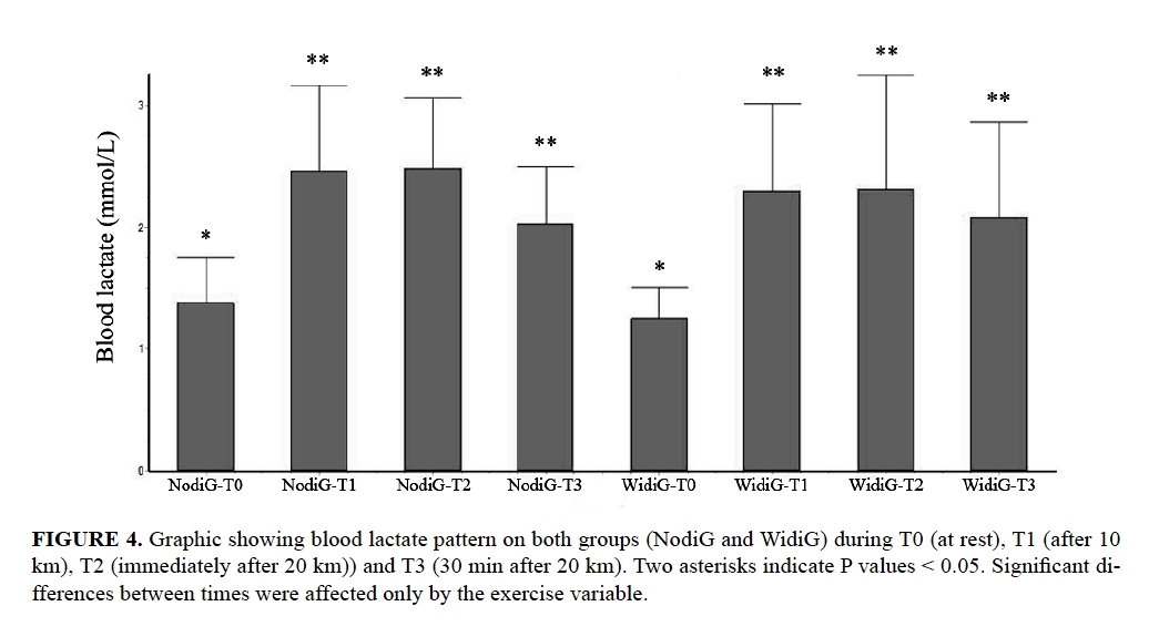 T0/T2, T1/T3 and T2/T3. Blood lactate levels exhibited a different