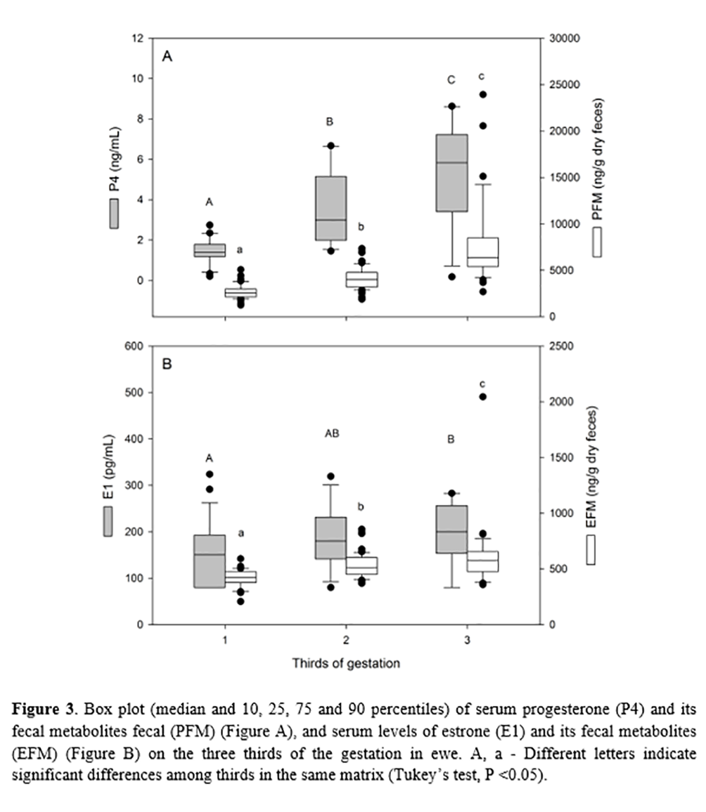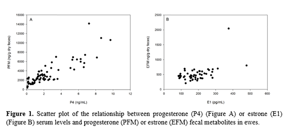 Thus, the aim of this study was to monitor progesterone and estrone fecal metabolite levels throughout gestation in ewes, correlating these factors with the serum levels of these steroid hormones.