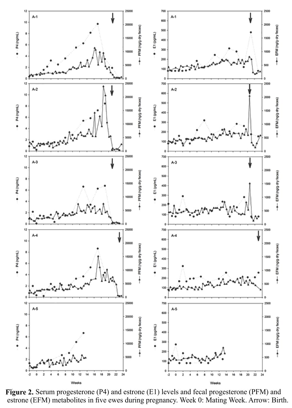However, although Schoenecker et al.(6) previously evaluated fecal metabolite levels of estrone during pregnancy in two wild ewes, there is no report of the correlation level between serum estrone levels and their fecal metabolites. Thus, the present study demonstrates the existence of a significant correlation of estrone between the two biological matrices evaluated during pregnancy.