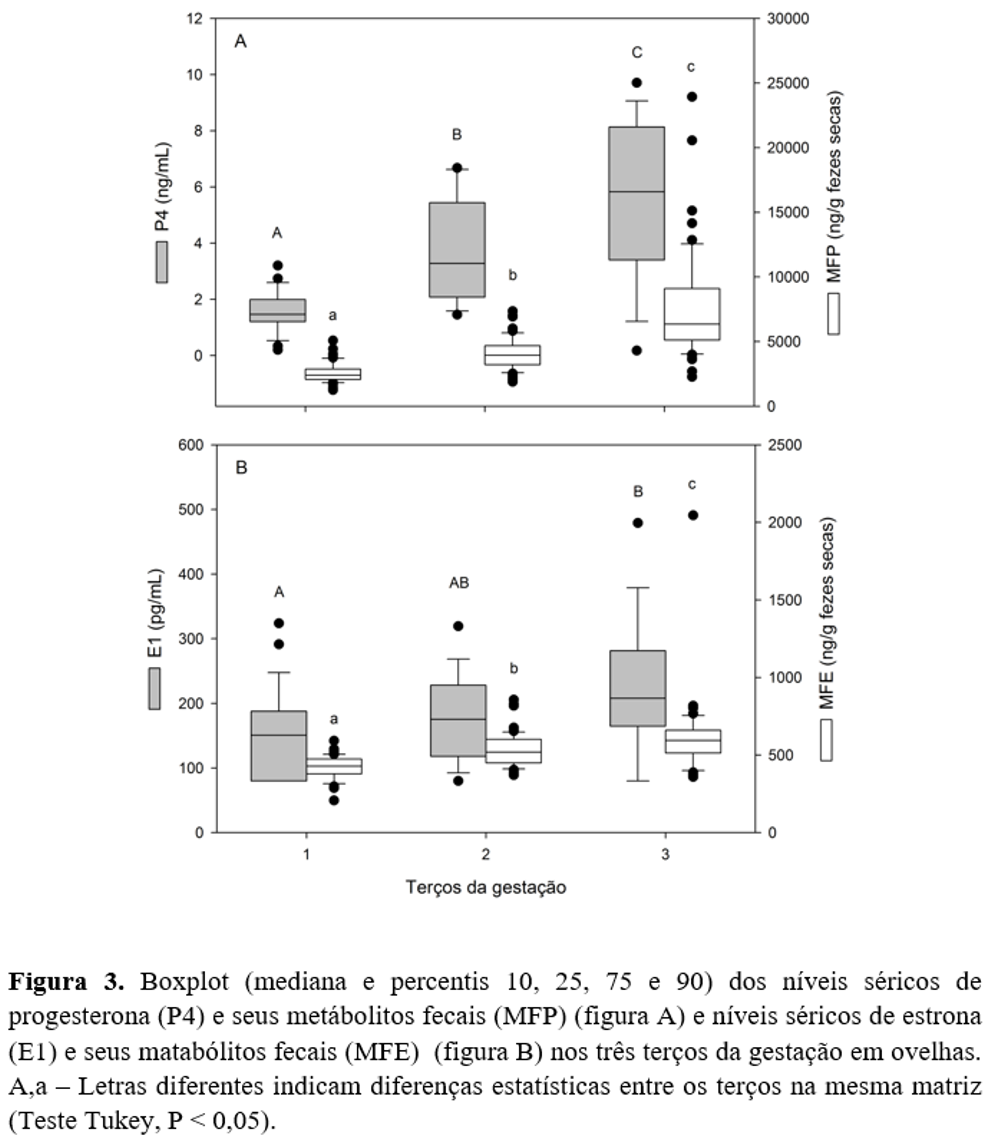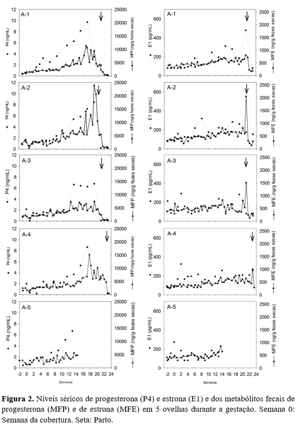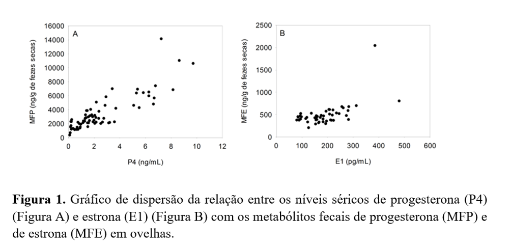 Considerando o metabolismo e as vias de excreção dos metabólitos dos hormônios esteroides reprodutivos(12), alguns pesquisadores avaliaram o uso de amostras fecais no monitoramento hormonal em ovinos. Os metabólitos fecais de progesterona foram avaliados durante o ciclo estral e gestação em ovelhas domésticas (Ovis aries)(13, 14) e selvagens (Ovis canadensis)(5) , observando alta correlação entre os metabólitos fecais e os níveis séricos de progesterona. Adicionalmente, Schoenecker et al.(6) também avaliaram os níveis de metabólitos fecais de progesterona e estrona em ovelhas selvagens prenhes, porém os níveis hormonais não foram correlacionados com os níveis séricos.