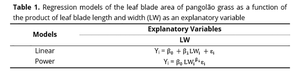 The estimated leaf blade area of pangolão grass was determined with the use of regression models, using as response variable (Yi) real leaf area (RLA) and as an explanatory variable the product of the length (L) and width (W) of each leaf blade, shown in the equations as LWi. In the regression model analysis, we used the linear model with normal distribution and the power model, assuming the response of the response variable is in the range (-∞;∞).