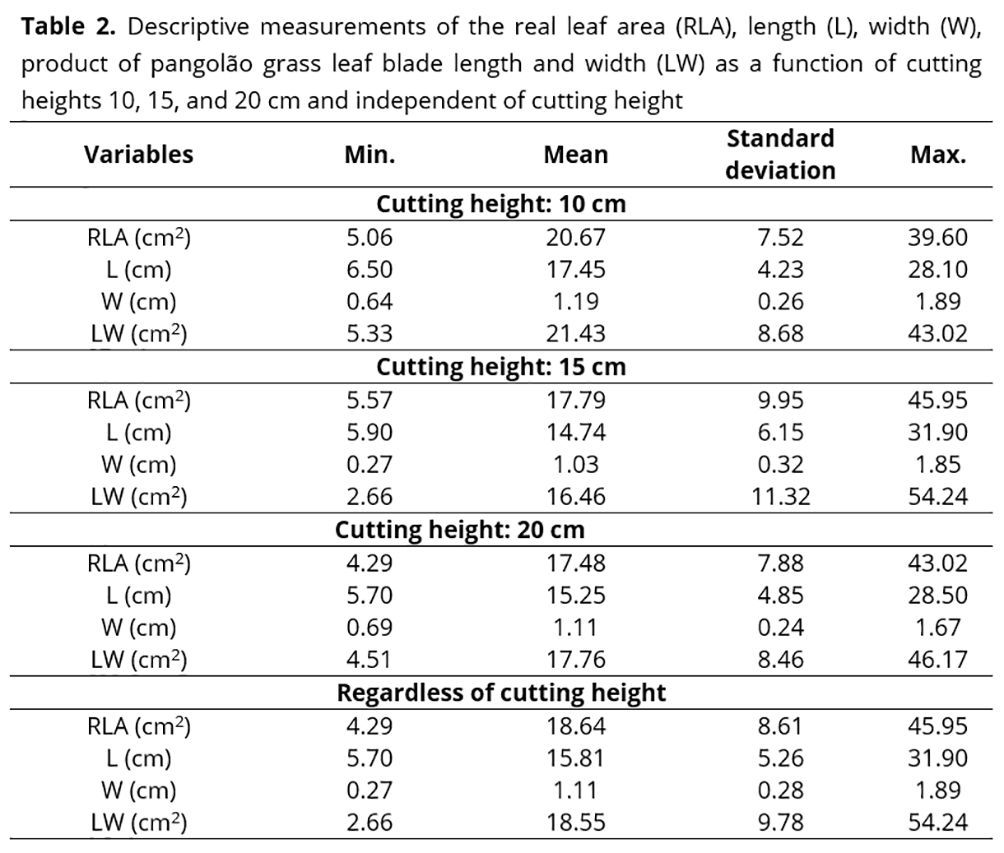 Pasture studies require information on leaf area, as it is one of the main parameters for evaluation of plant growth. Thus, the objective of this study was to estimate the leaf blade area of pangolão grass (Digitaria pentzii Stent.) using non-destructive methods by regression model analysis. The experimental design consisted of randomized blocks, with three cutting heights (10, 15, and 20 cm) and four replications. Three hundred leaf blades of pangolão grass were randomly collected, and their respective lengths (L) and widths (W) determined using a digital caliper. The leaf blade area of pangolão grass was estimated by the gravimetric method, using linear and power regression models to explain the leaf blade area as a function of the product of L and maximum W. The real leaf blade area presented an average value of 18.64 cm², ranging from 4.29 to 45.95 cm². The leaf blade area of pangolão grass, regardless of cutting height, was estimated with greater accuracy by the power model. The power model, Ŷ=LW1.007, can be used to estimate the leaf blade area of pangolão grass based on leaf blade L and W values.