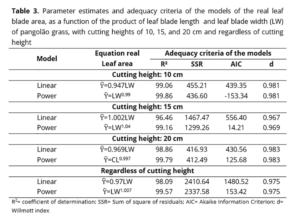 Table 3 shows the regression models and the adequacy criteria of the models, using as an explanatory variable the product of the length and width of the leaf blade pangolão grass (LW). Both regression models (power and linear) reliably determined leaf area of pangolão grass at a cutting height of 10 cm.