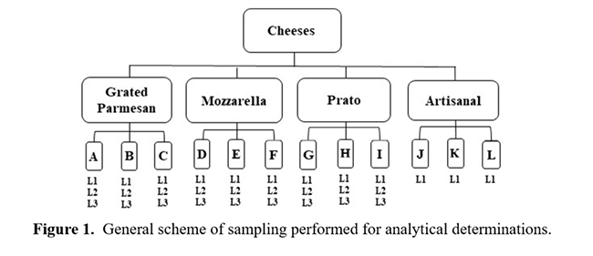 The cheese samples were purchased from commercial establishments in the western border region of Rio Grande do Sul, Brazil. The samples were then identified, transported in thermal boxes and stored under temperatures of -18° C until they were analyzed. Four types of cheeses (Grated Parmesan, Mozzarella, Prato and Artisanal) from three different leading brand names in the Brazilian market, were collected, to make a total of 12 brands (A, B, C, D, E, F, G, H, I, J, K, L). Three distinct lots (L1, L2 and L3) were evaluated from each brand with the exception of Artisanal cheese (Figure 1).