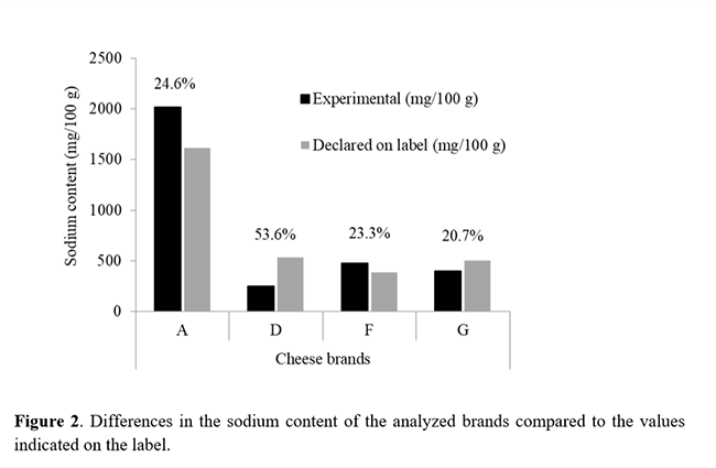 Table 1 lists the sodium concentration after analyzing each cheese brand from three different batches, in quadruplicate. The values reported on the labels by the manufacturers are also shown.