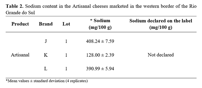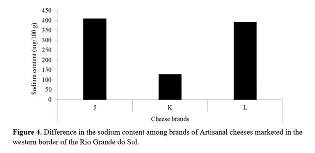 The Artisanal cheeses showed lower sodium concentrations. However, as salt is of great technological advantage, particularly in inhibiting the microorganisms, these low sodium levels can compromise the quality of the cheeses.