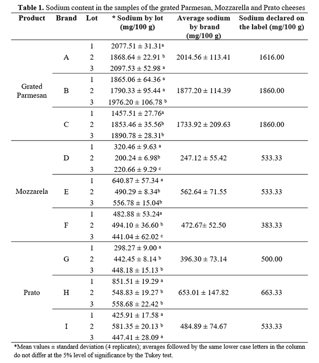 The results of Table 1 enabled the conclusion to be drawn that a significant difference (p <0.05) was evident between at least two lots of each cheese brand assessed. The differences in the sodium content among the various lots of brands A, B, C, D, E, F, G, H and I were as high as 10.9; 9.4; 22.9; 37.5; 23.5; 10.7; 33.4; 35.5; 26.7%, respectively. This clearly reveals that the companies showed no interest in standardizing the quantities of the ingredients added during the manufacturing process of a product. It is well known that standardization is the foundation for continuous improvements to be made. When adequate standards are implemented, they reduce the production errors, thus facilitating the production system to be continuously improved(12).