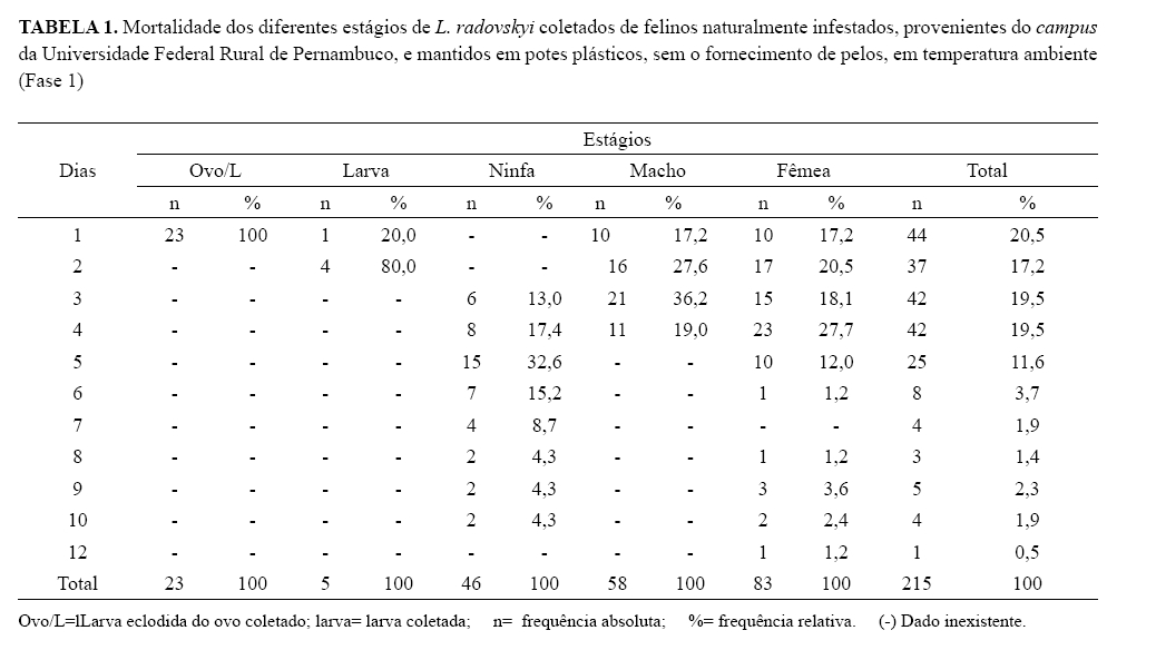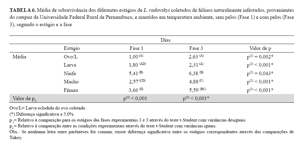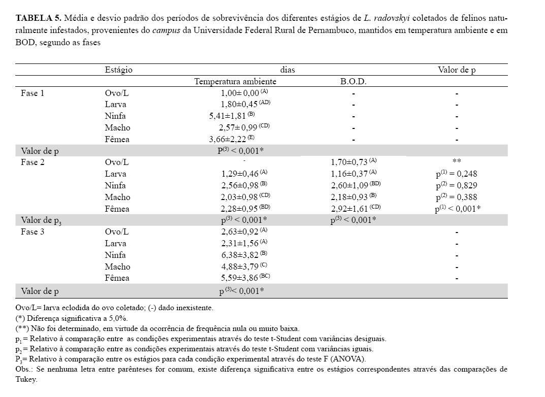 sobrevivência foi de um a cinco dias. Para todas as fases do
