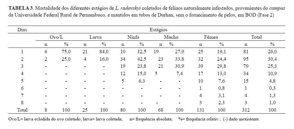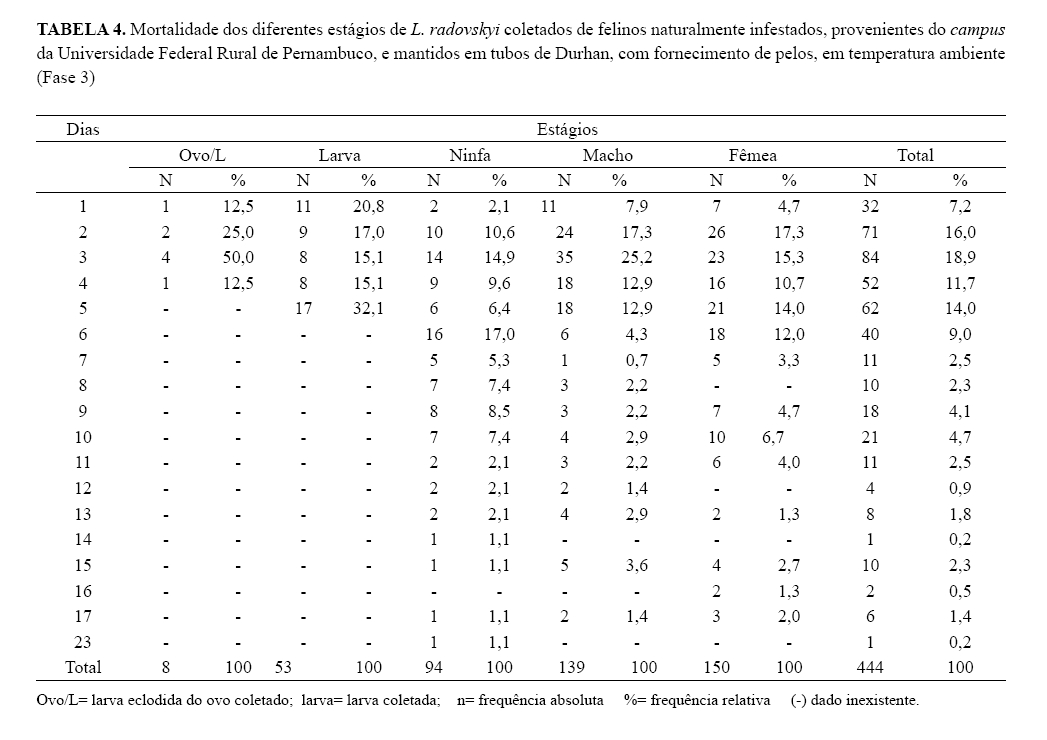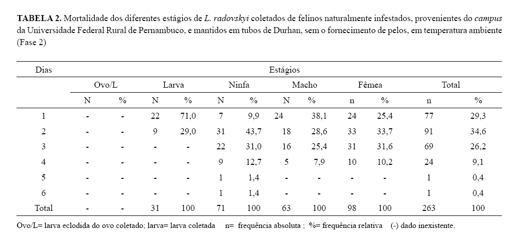 Desenvolveu-se este estudo com o objetivo de avaliar a possibilidade de sobrevivência dos estágios do ciclo biológico do ácaro Lynxacarus radovskyi fora do hospedeiro em condições de laboratório. Coletaram-se ovos, formas imaturas e adultas do L. radovskyi,
