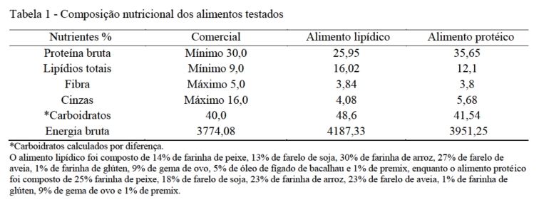 Os alimentos lipídico e protéico foram formulados seguindo as características determinadas para dietas de camarões de água doce do gênero Macrobrachium rosenbergii (NEW, 2002; MITRA & MUKHOPADHYAY, 2005). O alimento comercial utilizado para camarão de água doce foi uma ração bastante utilizada nas fazendas de cultivo do camarão M. rosenbergii.