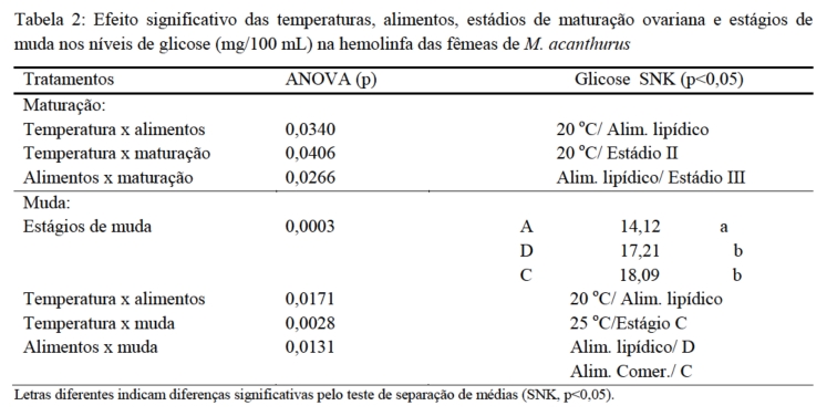 nos níveis de glicose, proteínas totais e lipídios totais na hemolinfa, tanto