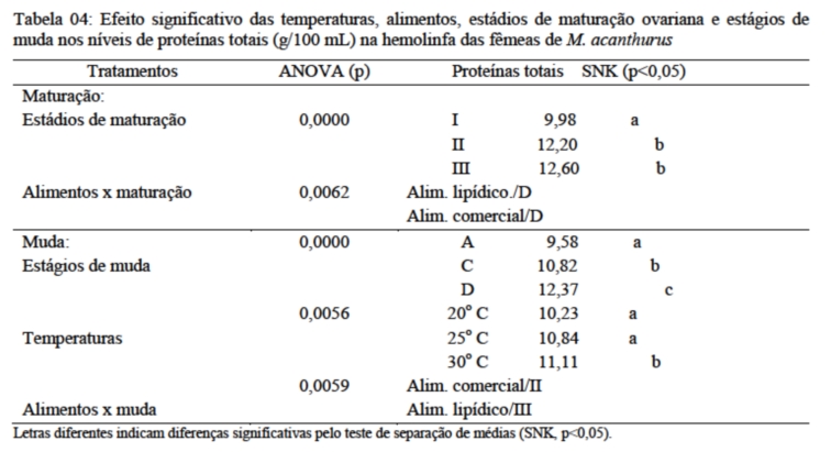 totais na hemolinfa e os alimentos comercial e protéico induziram ao aumento de