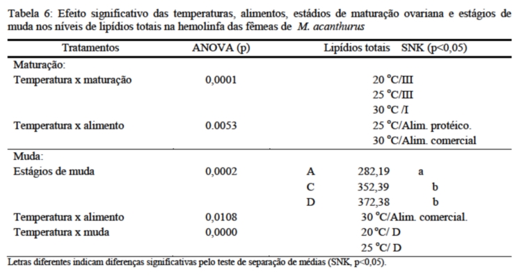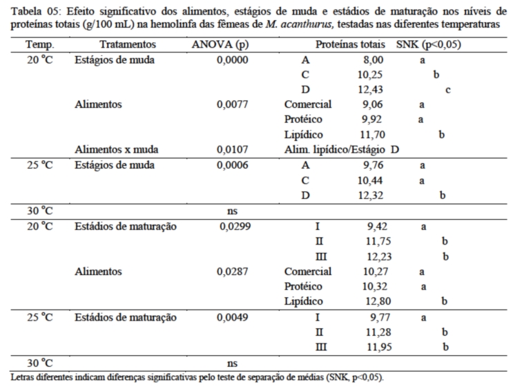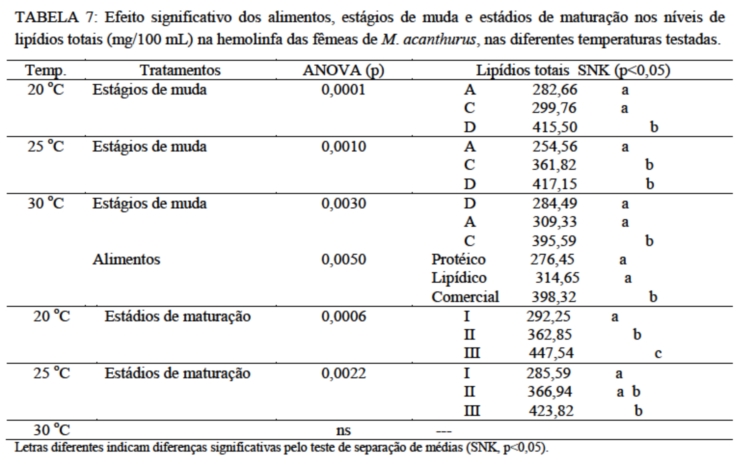 Os efeitos dos alimentos protéico, lipídico e comercial foram estudados, ao mesmo tempo, os camarões foram submetidos a três temperaturas, 20, 25 e 30oC, observando-se os estádios de maturação ovariana e os estágios de muda. Os efeitos dos alimentos foram analisados segundo os níveis de proteínas totais, lipídios totais e glicose na hemolinfa.