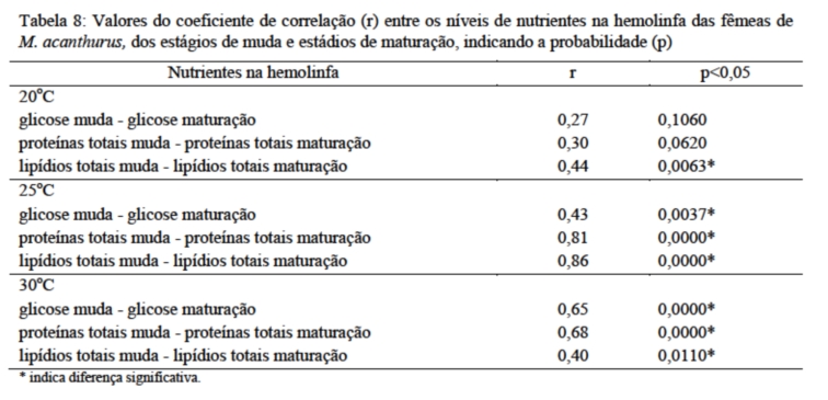 resultados mostraram que, nos estágios de muda, os níveis dos nutrientes na