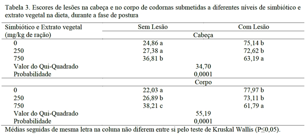 extrato vegetal/kg de ração), com cinco repetições e seis aves por parcela.