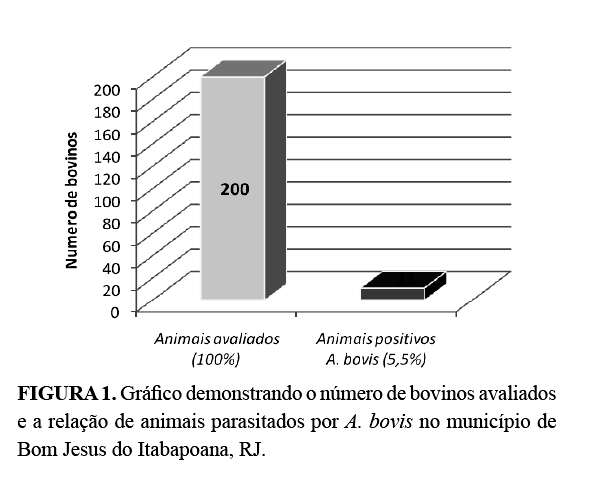 Dos duzentos animais avaliados, onze bovinos (5,5%) foram considerados parasitados por