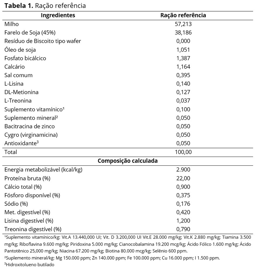 Para o ensaio de metabolizabilidade do resíduo de biscoito tipo wafer, foram utilizadas 100 codornas europeias, com 21 dias de idade. As aves foram distribuídas em delineamento inteiramente casualizado com dois tratamentos (ração referência – 0% de resíduo de biscoito e ração referência – 20% de resíduo de biscoito), com cinco repetições e 10 aves por unidade experimental. As dietas experimentais (Tabela 1) foram formuladas seguindo as recomendações nutricionais preconizadas por Rostagno et al.(18).