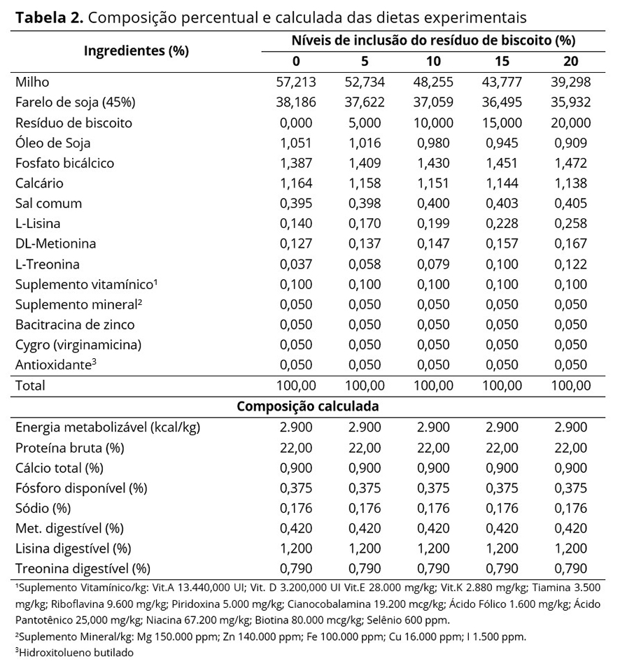 As aves receberam água e ração à vontade, durante o período de um a 42 dias. As dietas (Tabela 2) foram formuladas a base de milho e farelo de soja, segundo as exigências nutricionais preconizadas por Rostagno et al.(18), sendo as rações experimentais isoproteicas, isoenergéticas e isoaminoacídicas. Para inclusão do resíduo de biscoito às rações formuladas, foram considerados os valores de composição química do resíduo de biscoito encontrados no ensaio de metabolizabilidade.