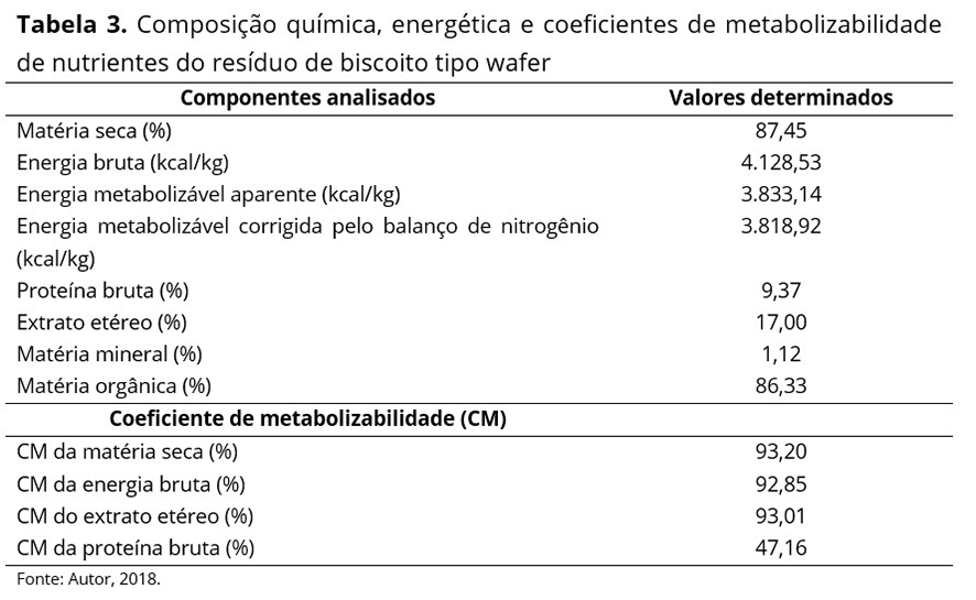 Na Tabela 3 estão apresentados os valores de composição bromatológica, energética e os coeficientes de metabolizabilidade do resíduo do biscoito tipo wafer (RB).