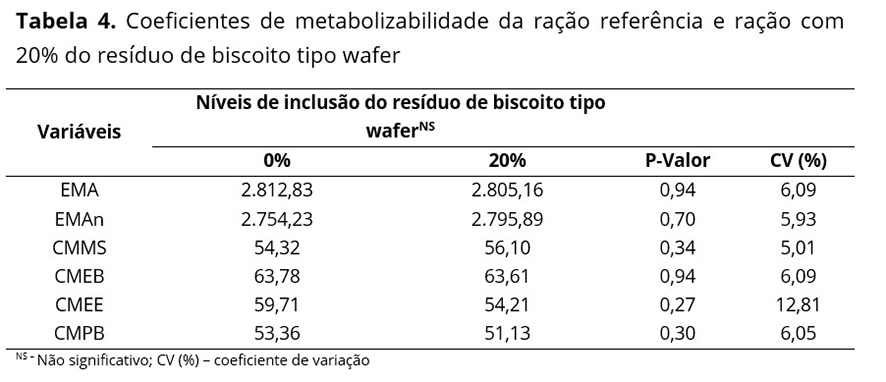 Na tabela 4 estão descritos os valores de energia metabolizável aparente (EMA), energia metabolizável aparente corrigida (EMAn), e os coeficientes de metabolizabilidade da ração referência e da ração teste contendo 20% de resíduo do biscoito tipo wafer.