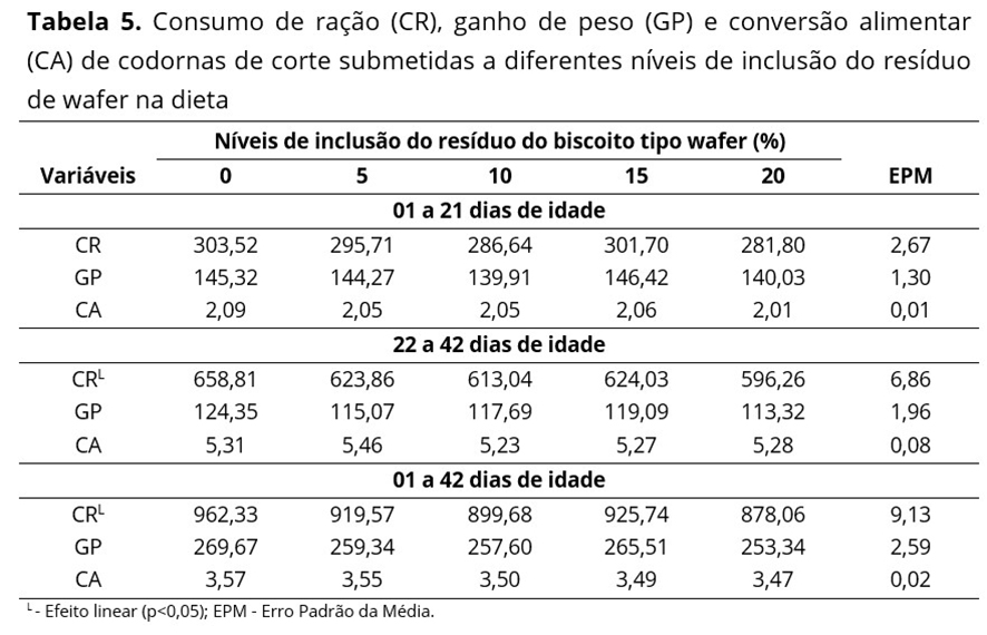 Os resultados referentes ao desempenho de codornas de corte alimentadas com diferentes níveis de inclusão de resíduo de biscoito tipo wafer são apresentados na tabela 5.