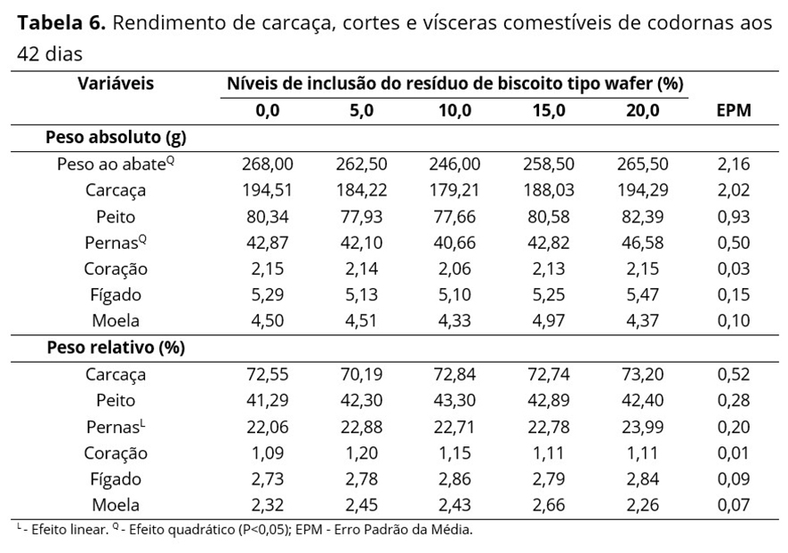 Os resultados referentes ao rendimento de carcaça, cortes e vísceras comestíveis de codornas aos 42 dias de idade são apresentados na tabela 6.