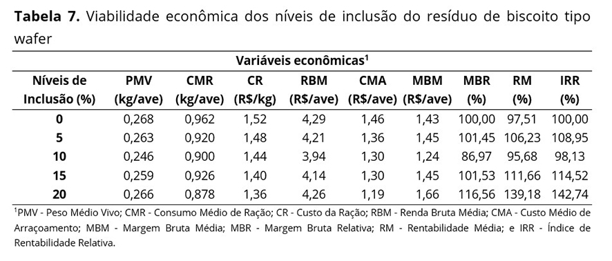 A viabilidade econômica foi realizada em função das variações no peso vivo, consumo de ração e custos das rações, que ocorreram entre os níveis de inclusão do resíduo utilizado, de acordo com a metodologia descrita por Lana(4). O preço de venda da codorna viva e os valores das matérias-primas utilizados para o cálculo dos custos das rações foram referentes aos atualizados no período de execução do experimento, sendo a codorna de um dia adquirida por R$ 1,40 a unidade, e sua venda estimada em R$ 16,00/kg da codorna abatida. O custo dos ingredientes utilizados para formulação das dietas foram os seguintes: Milho R$ 1,25/kg; Farelo de Soja R$ 1,45/kg; Resíduo de Biscoito tipo wafer R$ 0,30/kg; Óleo de Soja R$ 3,95/kg; Fosfato Bicálcico R$ 6,00/kg; calcário R$ 0,27/kg; Sal comum R$ 0,85/kg; Lisina R$ 9,00/kg; Metionina R$ 25,00/kg; Treonina R$ 11,00/kg; Suplemento Vitamínico R$ 20,00/kg; Suplemento Mineral R$ 10,00/kg; Bacitracina de Zinco R$ 15,00/kg; Cygro R$ 46,00/kg; BHT R$ 37,00/kg.