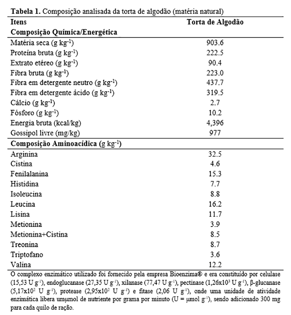 A composição química da torta de algodão é apresentada na Tabela 1.