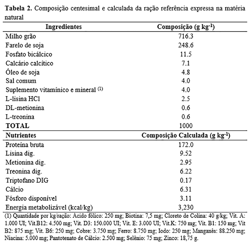 As dietas experimentais consistiram de uma ração referência (à base de milho e farelo de soja); uma ração referência (à base de milho e farelo de soja) com o complexo enzimático; uma ração teste (70% de ração referencial + 30% de torta de algodão); e uma ração teste (70% de ração referencial + 30% de torta de algodão) com o complexo enzimático. A ração referência foi formulada para atender às exigências nutricionais descritas pelas Tabelas Brasileiras para Aves e Suínos(5) (Tabela 2).