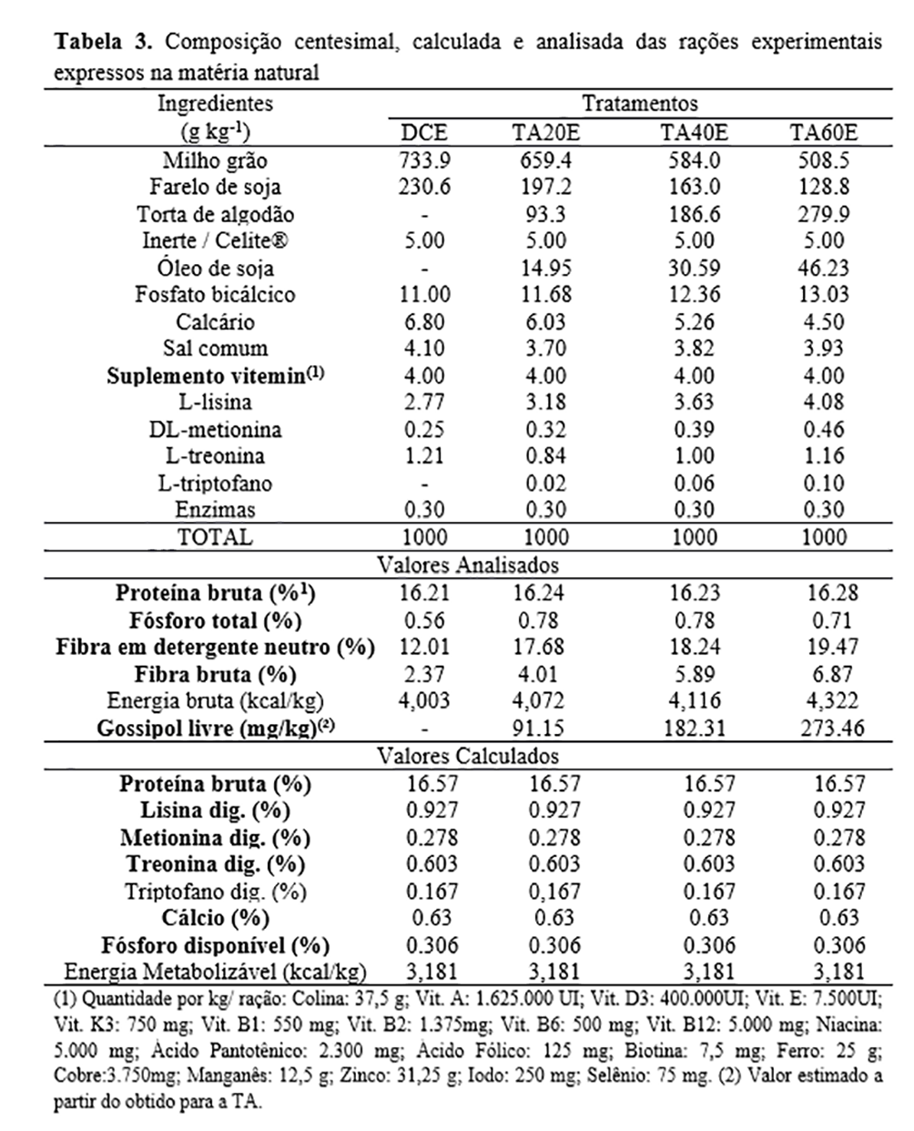 A determinação da composição de aminoácidos totais da torta de algodão foi realizada pela Empresa Evonik Industries AG Feed Additives/Animal Nutrition Services, através de espectroscopia por infravermelho próximo (NIR). A quantidade de gossipol livre (GL) da torta de algodão foi determinada no laboratório Labtron®, utilizando a metodologia descrita por Pons and Guthrie(9).