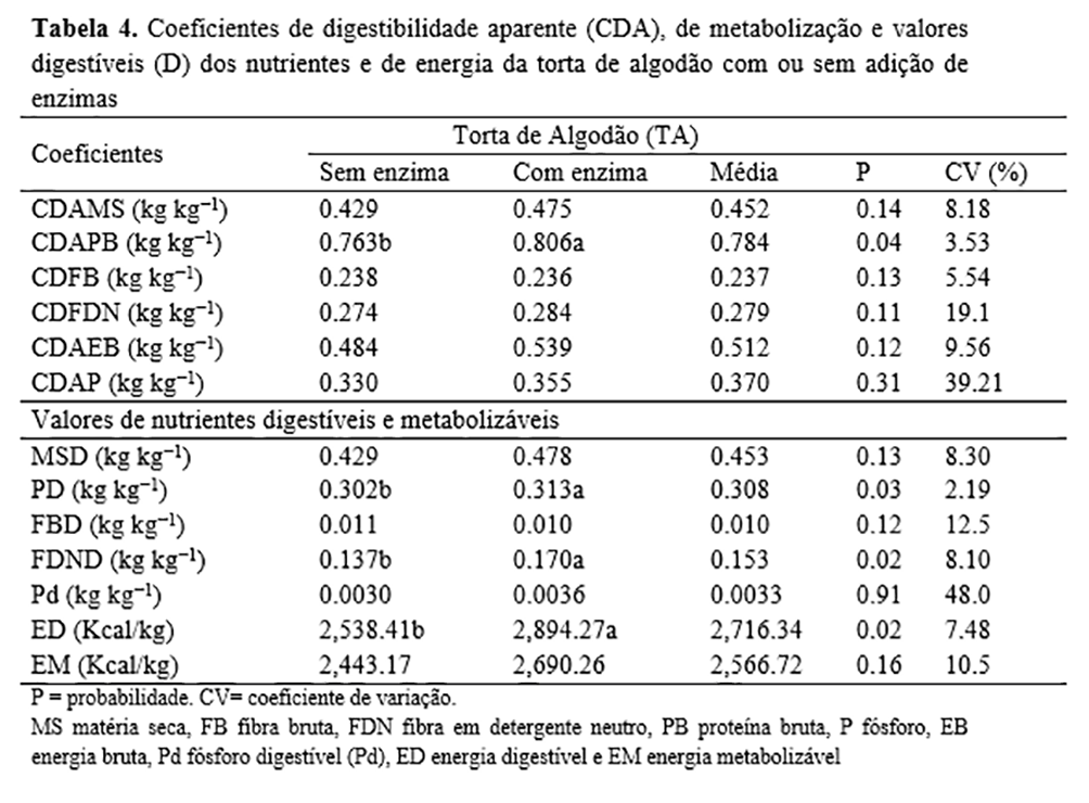 A avaliação dos resultados do coeficiente de digestibilidade aparente da proteína bruta e o valor de proteína digestível sugerem que a presença do complexo enzimático possivelmente auxiliou na disponibilização de nitrogênio da torta de algodão, potencializando o uso de proteínas pouco disponíveis ou conjugadas a fatores antinutricionais. O aumento na liberação de nitrogênio pode ter ocorrido através da hidrólise dos PNA, que atuam como barreira física sobre a digestão e absorção de nutrientes, devido ao aumento da viscosidade intestinal(13).