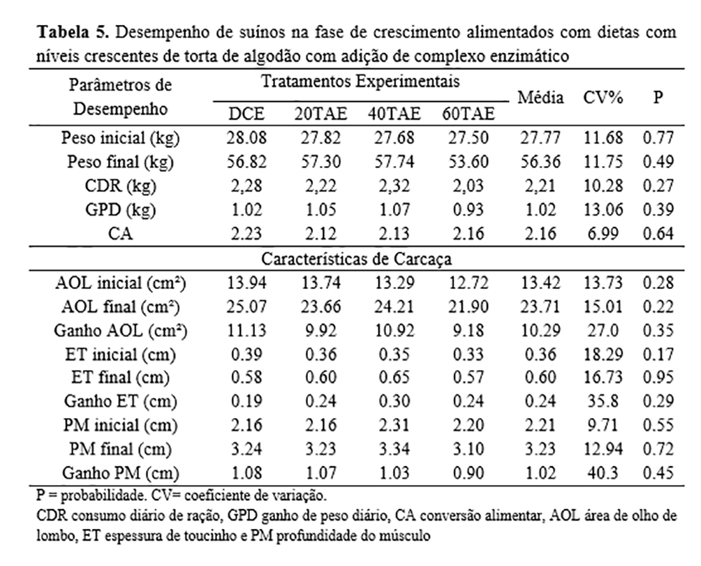 Uma alternativa para a degradação de fibra da torta de algodão é a adição de complexo de enzimas digestivas nas rações. As enzimas exógenas irão promover a ruptura da parede celular, reduzir a viscosidade intestinal provocada pelos polissacarídeos não amiláceos, além de suprimir os efeitos de propriedades antinutricionais presentes nos alimentos(3). A suplementação enzimática pode atuar como uma ferramenta importante favorecendo a digestão de forma eficiente, facilitando a digestão e aumentando a disponibilidade de nutrientes. Assim, objetivou-se avaliar o valor nutricional da torta de algodão com e sem adição de complexo enzimático e os níveis de substituição da proteína do farelo de soja pela proteína da torta de algodão com suplementação de complexo enzimático em dietas para suínos na fase de crescimento.