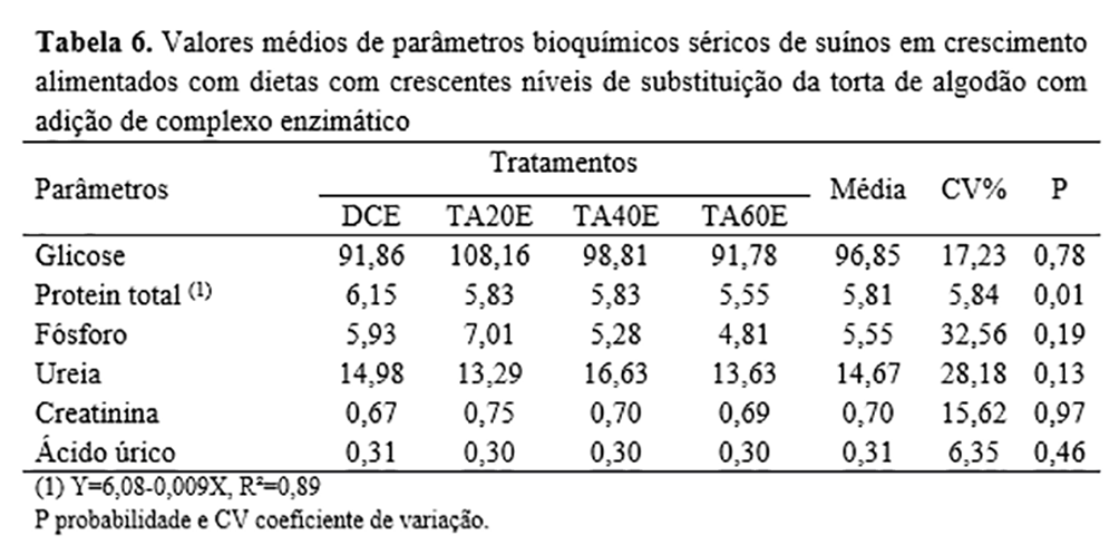 A proteína total sérica dos animais apresentou uma redução linear (P<0,001), em aproximadamente 10% em função aos níveis de substituição da proteína do farelo de soja pela proteína da torta de algodão. Enquanto os níveis de glicose, fósforo, ureia, ácido úrico e creatinina não foram influenciados.