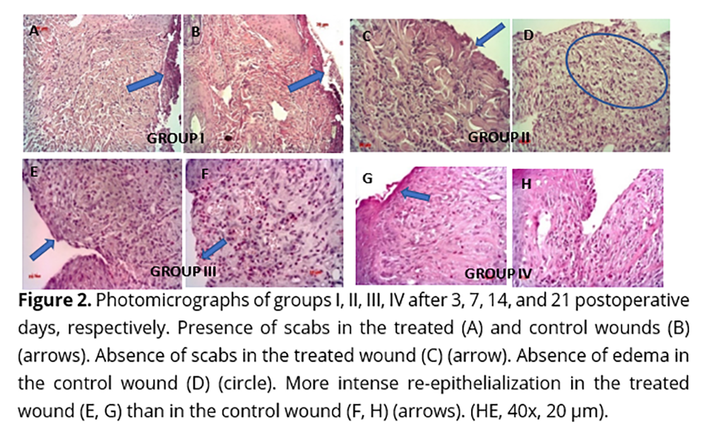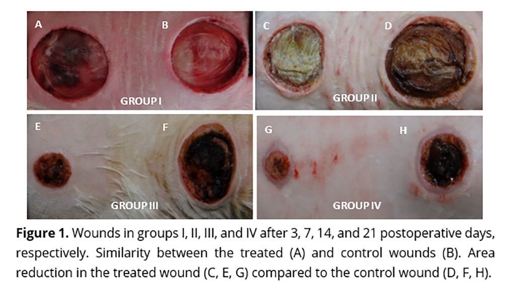 The groups (GI, GII, GIII, and GIV) were compared for morphometric (color, granulation, scabs, hyperemia, edema, and exudate) and histological variables (necrosis, re-epithelialization, active hyperemia, edema, hemorrhage, neovascularization, fibrosis, and inflammatory infiltration) using the Wilcoxon test (nonparametric data) and considering a p-value ≤ 0.05 significant. The Tukey test was used to compare the groups for area and scar contraction potential (parametric data) considering a p-value ≤ 0.05 significant. The Pearson's linear correlation was used to analyze morphometric and histological variables of control and treated wounds in the different observation groups considering a 5% significance level. The R statistical software was used for all analyses.