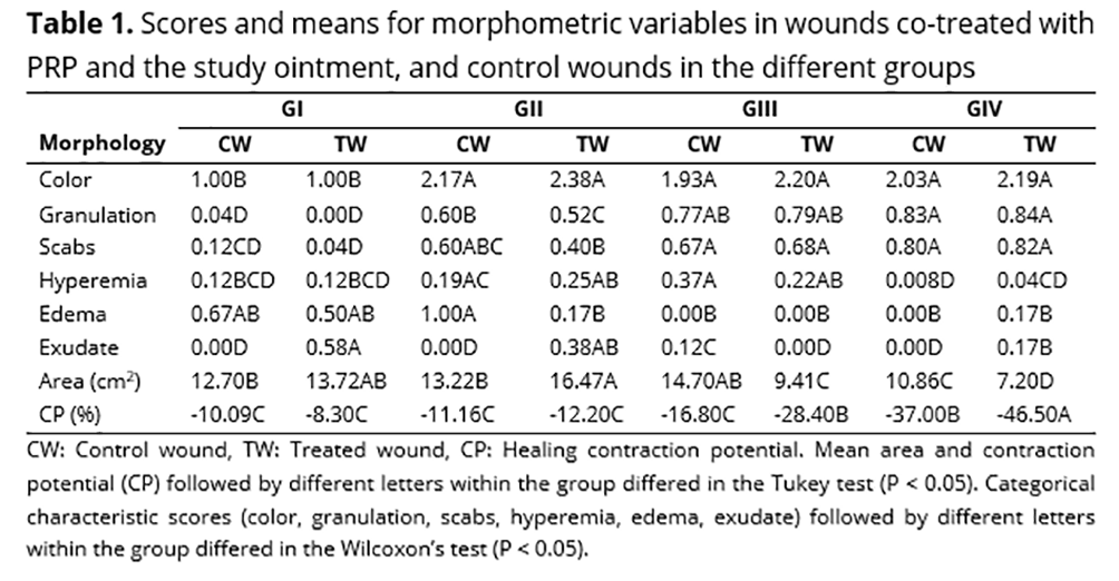 The co-treatment with heterologous PRP and the study ointment decreased edema in the initial phase of the healing process and stimulated an anti-inflammatory action.