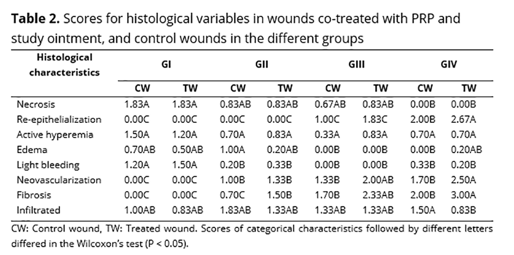 The wounds co-treated with PRP and the study ointment showed increased neovascularization and fibrosis with decreased inflammatory infiltration at day 21 PO.