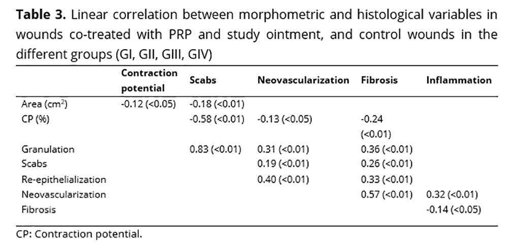 A significant negative linear correlation (P < 0.05) was also seen between inflammation and presence of fibrosis (r = -0.14) (Table 3), a fact not observed in previous studies using a similar methodology(26,27,28,29,30). Therefore, this experiment showed that PRP stimulates angiogenesis and re-epithelialization without generating an intense inflammatory process that could impair healing.