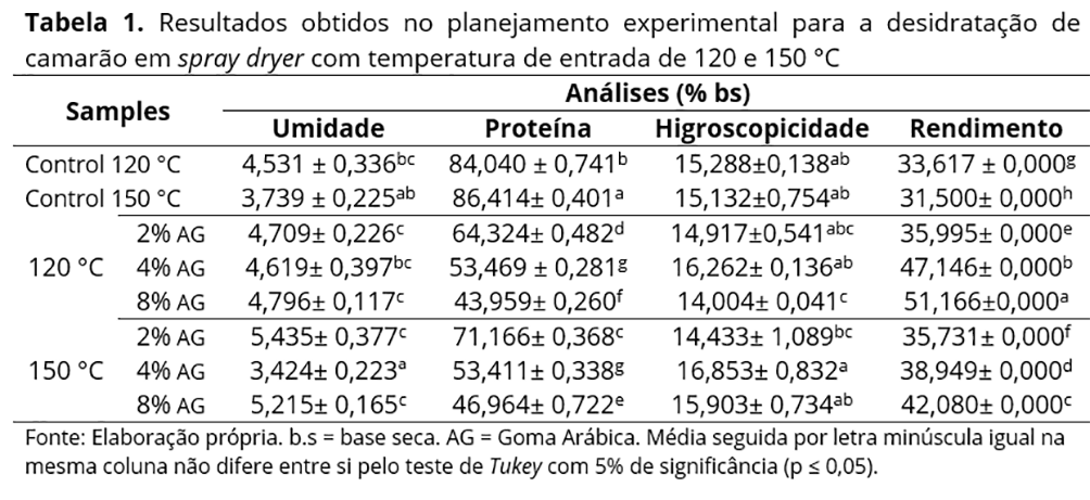 A Tabela 1 relata os resultados dos parâmetros avaliados no estudo da goma arábica na desidratação de camarão em spray dryer na temperatura de 120 °C. Os resultados para o parâmetro de umidade, nos ensaios em que foi utilizada a temperatura de entrada de 120 °C, mostram que o aumento da concentração de goma arábica não teve efeito na umidade final dos ensaios, não apresentando diferença significativa entre os ensaios e o controle. Na temperatura de entrada do ar de secagem de 150 °C foi observado que o ensaio controle com 4% de goma arábica apresentou a menor umidade, não havendo um comportamento linear com o aumento da concentração da goma arábica.