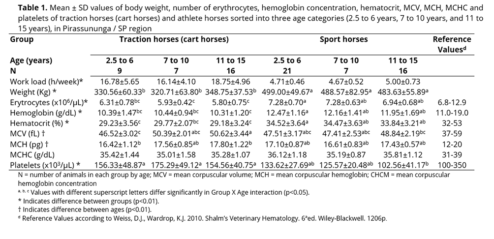 Concerning the difference animals' age, horses aged 2.5-6 years showed lower MCV and MCH compared to the horses aged 11-15 years. This is in disagreement with the results described by Melo et al.(24), however they used only one single breed with similar feed management and physical conditioning.