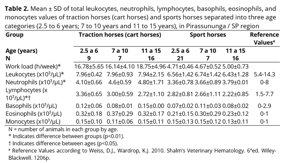 Furthermore, the parameters utilized for interpretation of the hematologic exams are based on the evaluation of animals with different factors involved, such as the breed, age, sex, and physical conditioning, among others(7), besides extrinsic factors such as sanity, management, and the intensity of the physical activity performed(8,9). It is suggested that these parameters do not represent the actual values found in several animal categories, such as equestrian sport and cart horses. Hence, there is a need to find the hematologic parameter ranges for these animals in order to establish specific reference values for horses from these categories.